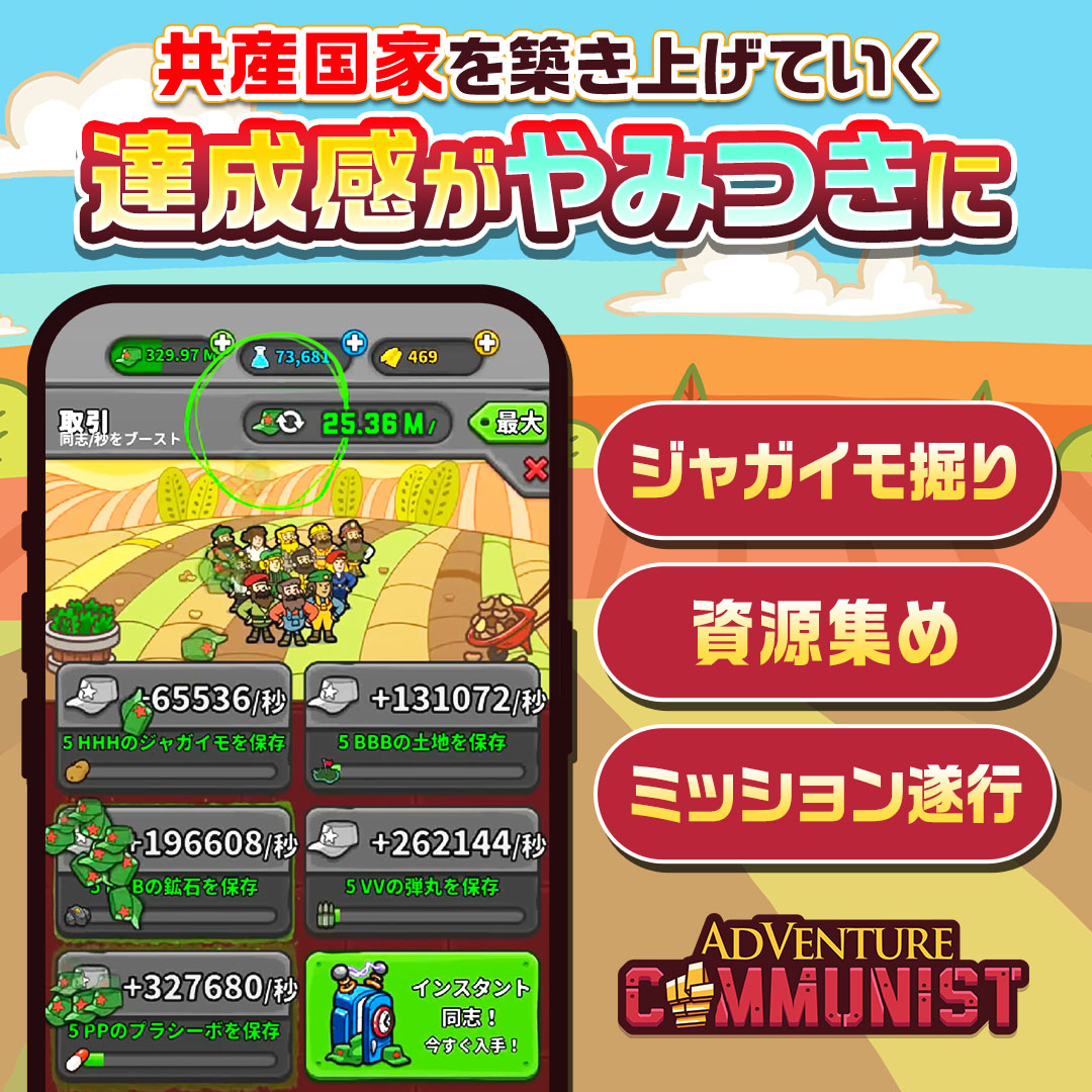 『AdVenture Communist』は、ジャガイモの生産を起点に国家を拡大していく放置系クリッカーシミュレーションです。指導者として農家やコミューンを増やし、生産ラインを強化しながら国力を拡大していきます。タップ操作で資源を集め、研究者カードを活用して生産効率を上昇させることで、数字は指数関数的に増加。放置中も資源が蓄積されるため、短時間プレイでも着実に進行できます。さらに期間限定イベントやランク制度も用意されており、やり込み要素も充実。シンプル操作ながら効率化の戦略が問われる、インフレ爽快系の放置ゲームです。
