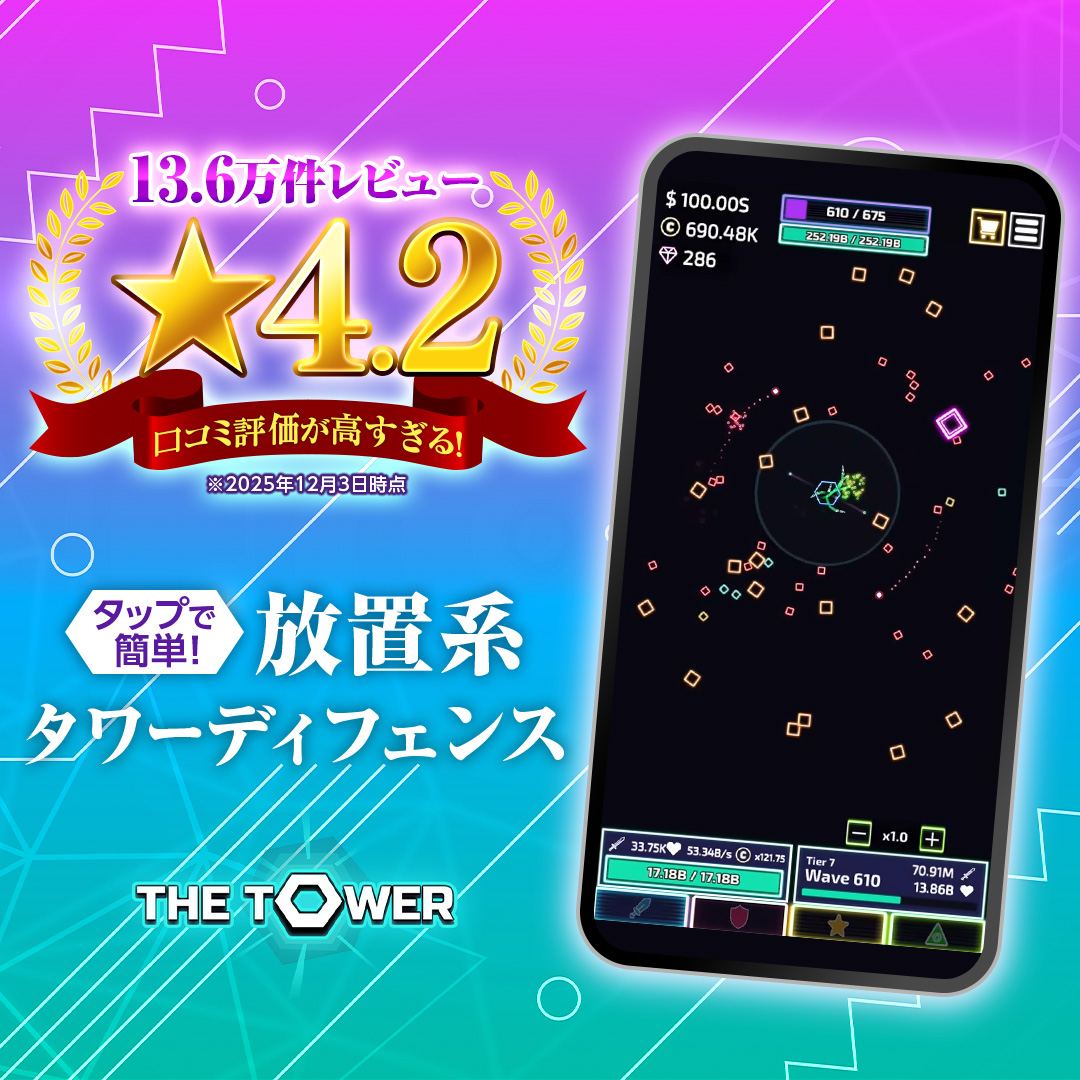 『The Tower – Idle Tower Defense』は、一本の塔をひたすら強化し、四方八方から押し寄せる敵を撃退していくシンプルなタワーディフェンスゲームです。 操作は非常に簡単で、基本はタップのみ。塔は自動で攻撃を行うため、プレイヤーは攻撃力や防御力、攻撃速度などのアップグレードを管理しながら、どこまで生き残れるかに挑戦します。 本作の特徴は、プレイごとに得られるリソースを使って行う「永続強化」。一度強化した能力は次回以降も引き継がれるため、何度でも挑戦することで確実に塔が強くなっていきます。 また、カードやスキル、研究要素などのやり込み要素も豊富で、成長を実感しながら長く楽しめる設計になっています。 オフラインプレイにも対応しており、隙間時間からじっくり腰を据えたプレイまで幅広く対応。シンプルながら奥深い、コツコツ育成が好きな人に特におすすめの作品です。